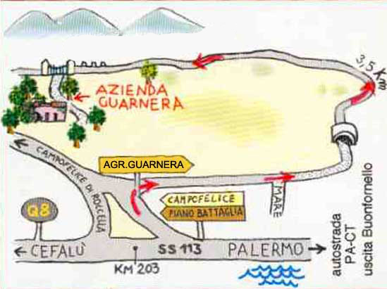 Leave the motorway A19 at the exit of “Buonfornello” and take the SS. 113 towards Cefalù. After 4 km, between km 201 and 202, turn right towards the junction “Campofelice di Roccella” and, immediately to the right, follow the signpost “Agriturismo Guarnera” driving on of 1,5 km until you reach an underpass. After the latter drive for a further 1,8 km until you reach a green gate on the left that gives access to our property.